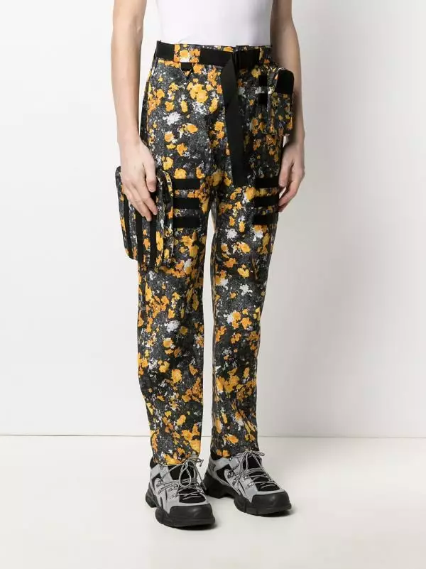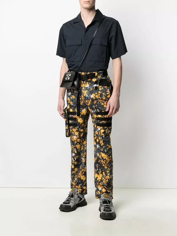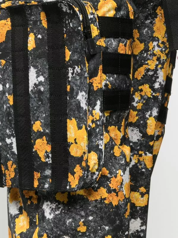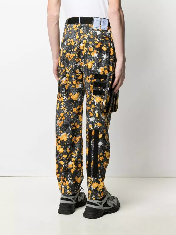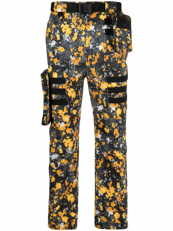Black and yellow abstract-print cargo trousers from MCQ featuring an abstract print, a belted waist, a straight leg and two pouch pockets.
