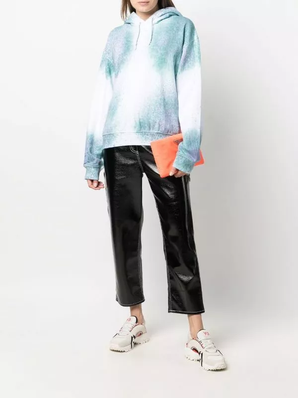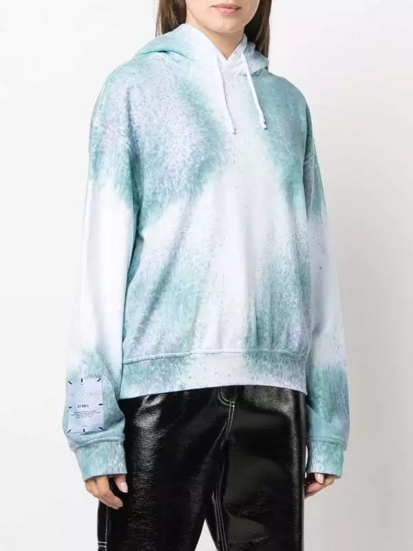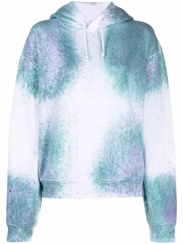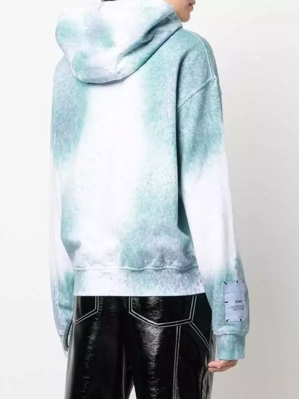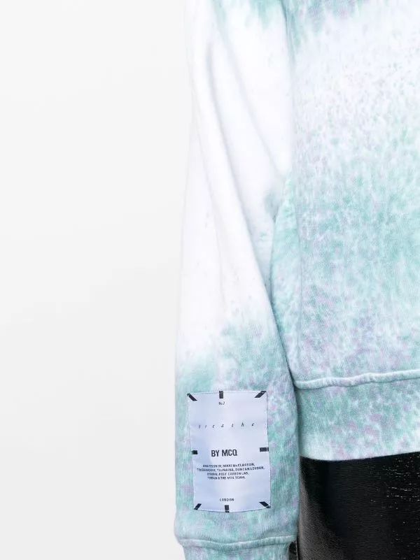 Marine blue cotton ‘Breathe’ tie-dye cotton hoodie from MCQ featuring tie-dye print, drawstring hood, long sleeves, ribbed cuffs, ribbed hem and logo patch at the sleeve.