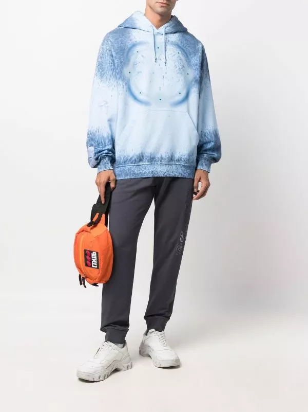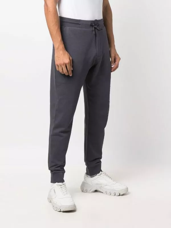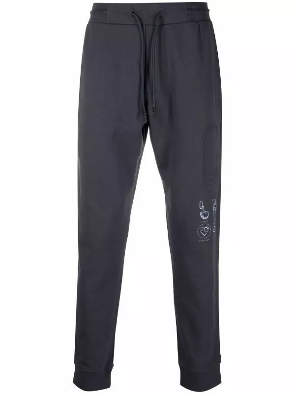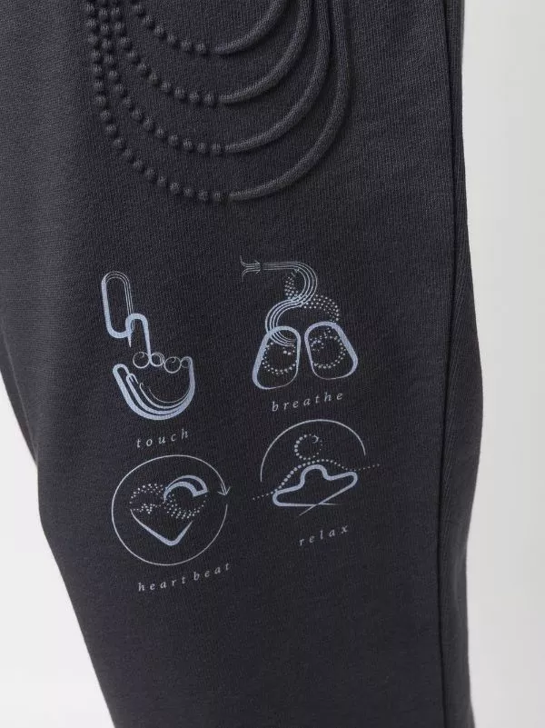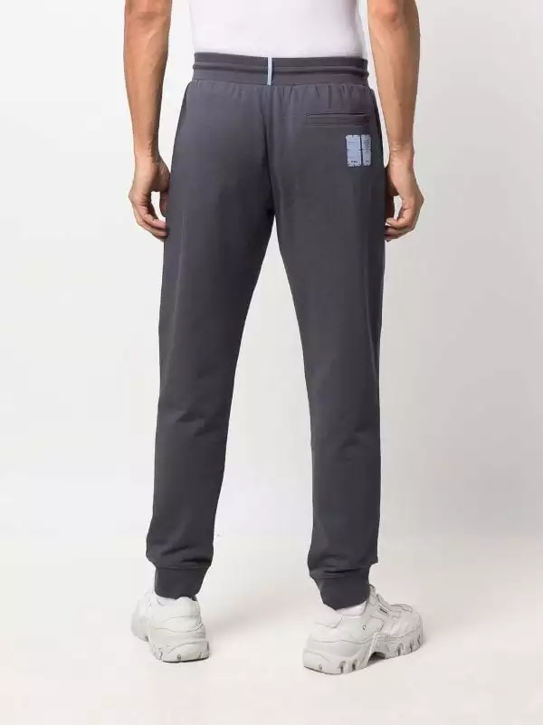 Grey cotton casual track pants from MCQ featuring elasticated drawstring waistband, straight leg, ribbed cuffs and contrasting printed cartoon on the leg.